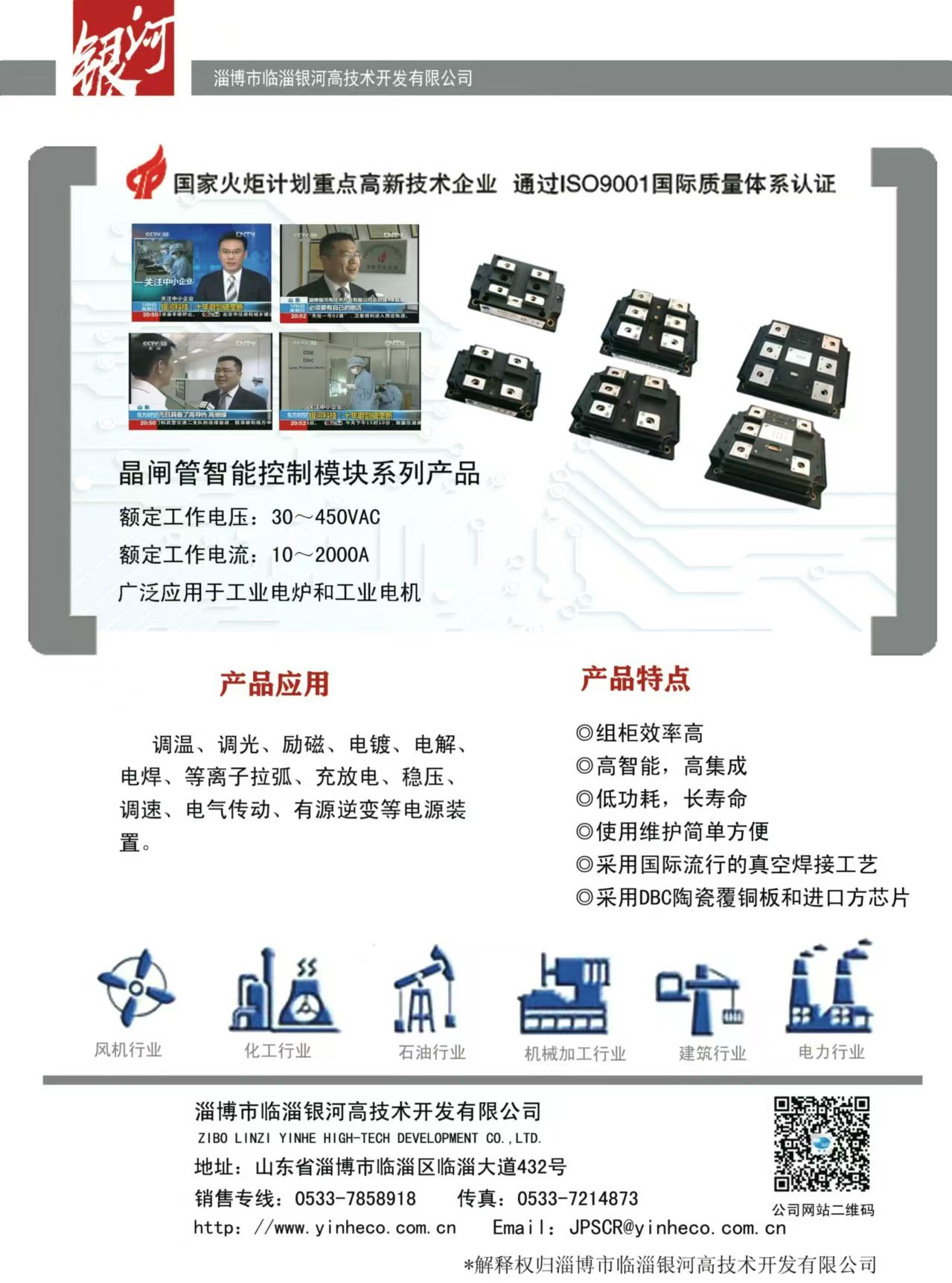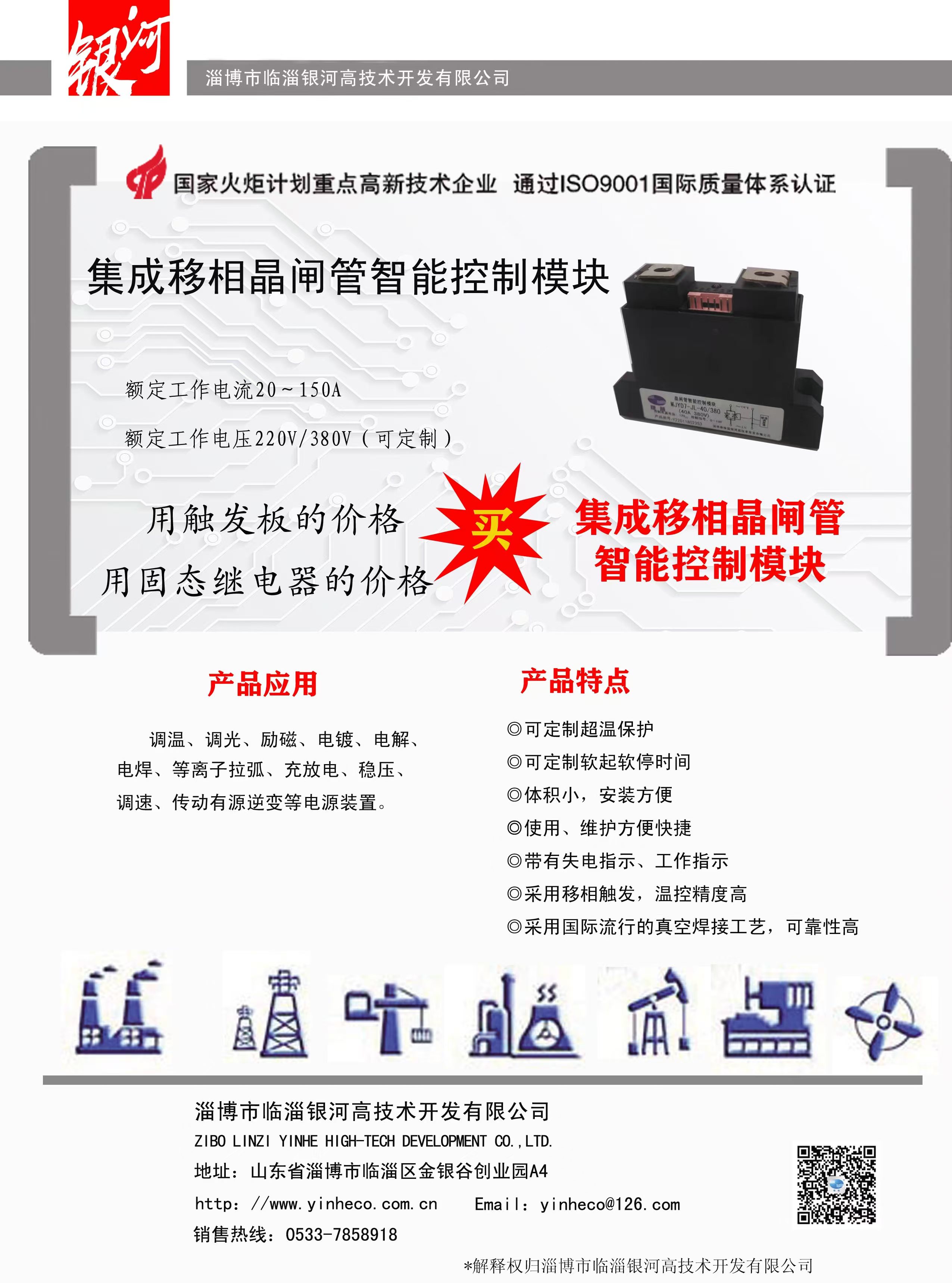 主要產(chǎn)品:DBC陶瓷覆銅板(190.5×138mm的母板或蝕刻線路的單、雙面成型零件)、大功率LED陶瓷覆銅散熱基板、聚光太陽(yáng)能光伏陶瓷覆銅散熱基板、射頻電路用陶瓷覆銅板;晶閘管智能控制模塊、恒流恒壓控制模塊、除鐵器模塊、MTC、MTX、MTG、MDC、MDS、MDQ、SSR(固態(tài)繼電器)、晶閘管移相觸發(fā)控制板、恒流恒壓控制板、雙閉環(huán)直流調(diào)速控制板、蓄電池充放電控制板等;承接各類控制柜(加熱電源控制柜、直流調(diào)速屏、交流或直流電機(jī)軟起動(dòng)控制柜,充電電源控制柜、電鍍或勵(lì)磁電源控制柜等)。